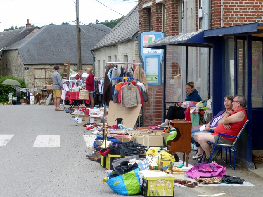 Rond 3 uur in de middag komen we door een dorp waar een rommelmarkt wordt georganiseerd. Ze noemen dat hier een brocante. Dat klinkt mooi. Juist als wij hier zijn begint het te regenen. We wandelen door de dorpsstraat langs de ‘kramen’. Je ziet dezelfde soort spullen als bij een rommelmarkt bij ons, zoals kop en schotels, borrelglazen en oude boeken. Een aantal verkopers probeert de spullen droog te houden door er plastic over te leggen of het weer in te pakken. We zetten een paar uur later onze tent op op een grote familiecamping.