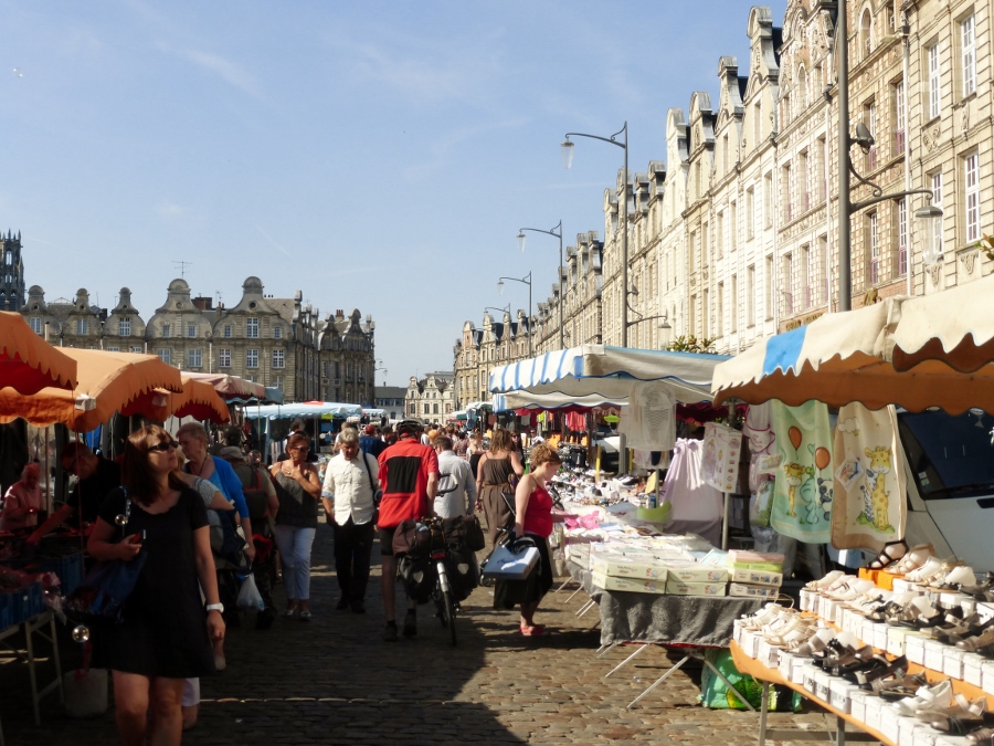 Arras is een prachtige ‘Vlaamse’ stad in Frankrijk. Het heeft vooral een mooi groot plein met vandaag een markt en veel drukte. Na ons bezoek aan deze stad gaan we verder de rust in van het Noord-Franse platteland. In een klein dorpje komen we zomaar langs de weg een zaak tegen waar ze fruit verkopen. We kopen wat appels. Dat is nooit verkeerd voor onderweg. Als we langs een lang kanaal fietsen is het wegdek van wisselende kwaliteit, zeg maar niet al te best.
