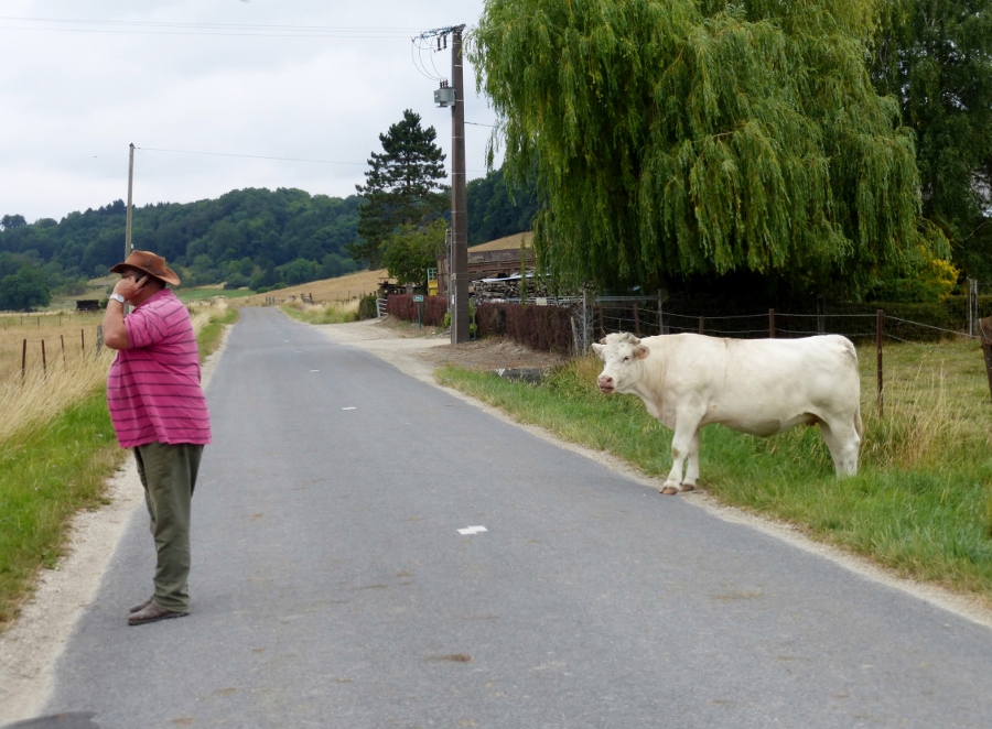 Op een weggetje staat een koe op het wegdek. Een Fransman maant het weinige verkeer dat hier langs komt langzaam te rijden en probeert in dezelfde tijd telefonisch de eigenaar van de witte koe te vinden.