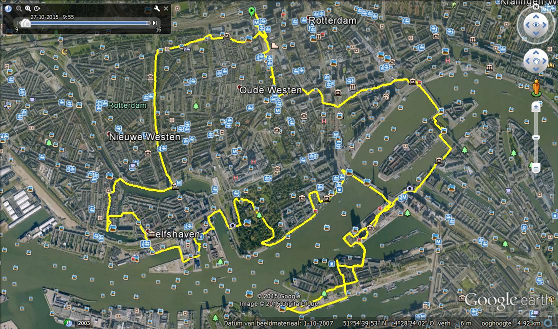 Een rondje wandelen door Rotterdam met broer Piet. Start bij Station Rotterdam Centraal, Weena, Heemraadsingel, Coolhaven, Delfshaven, Schiehaven, Sint Jobshaven, Euromast, Parkheuvel, Nieuwe Maas, Veerhaven, Erasmusbrug, Hotel New York, Katendrecht met SS Rotterdam, Willemsbrug, Wijnhaven, Leuvehaven, Station Rotterdam Centraal.