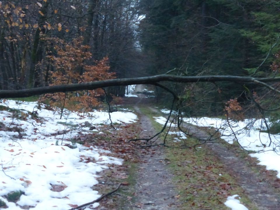 Links van ons is de houten afrastering van het park met de brutale aapjes. Op de Soerenseweg gaan we het bos in. Het wordt nu licht. Ook hier ligt nog veel langzaam smeltend sneeuw.