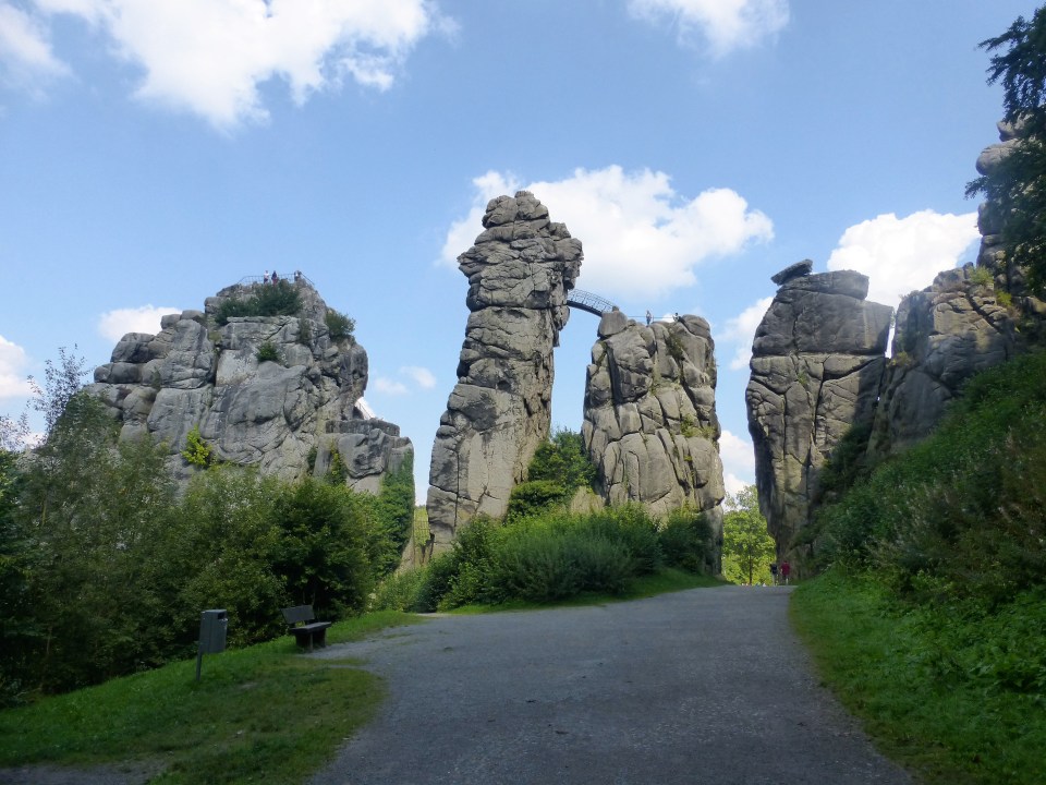 In de loop van de middag zit ik weer in een heuvelachtig gebied, ten zuiden van Horn. Hier kom ik voorbij de Externsteine. Dit zijn omhoogstekende rotsen zo maar in het niks. Je kan een kaartje kopen en daarna via een ijzeren trap omhoog lopen. Over een brug kan je zelfs van de ene rots naar de andere lopen. Ik hoef niet zonodig.