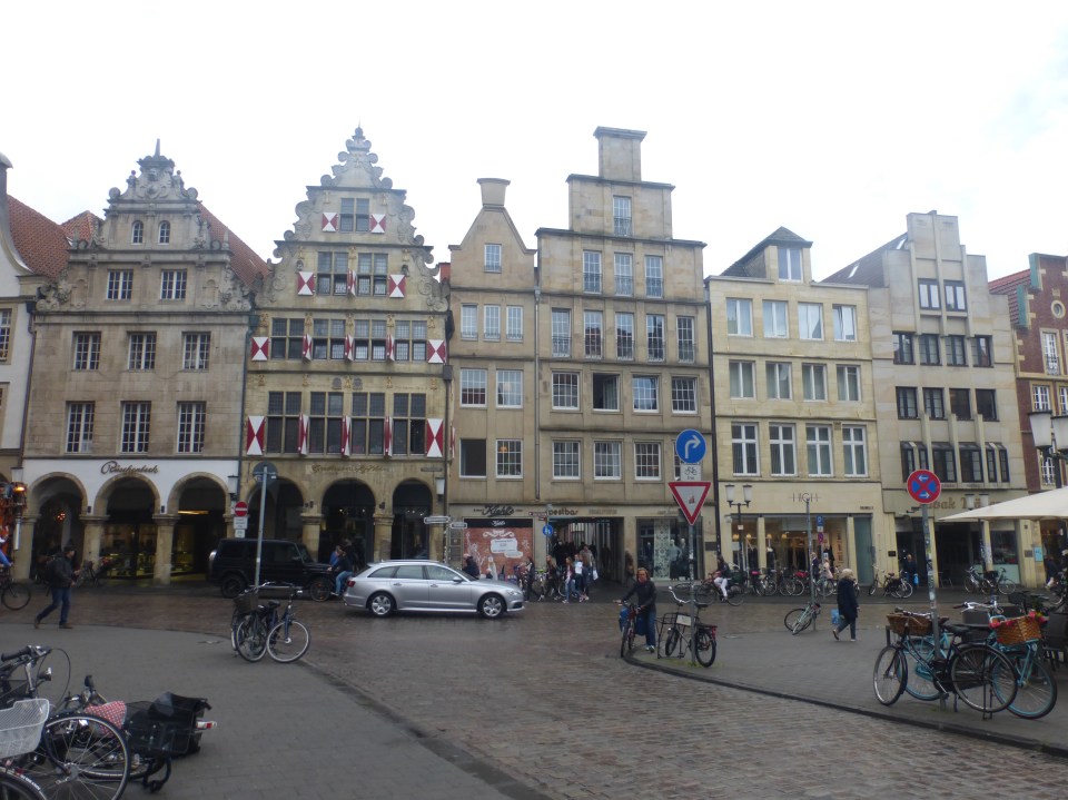 De binnenstad van Münster ziet er niet zo gezellig uit als op een droge dag. Alle terrassen zijn leeg en de mensen lopen onder paraplu’s of in regenkleding. Na mijn bakkie cappuccino binnen in een zaakje op de hoek tegenover een grote kerk komt de zon weer een beetje door.