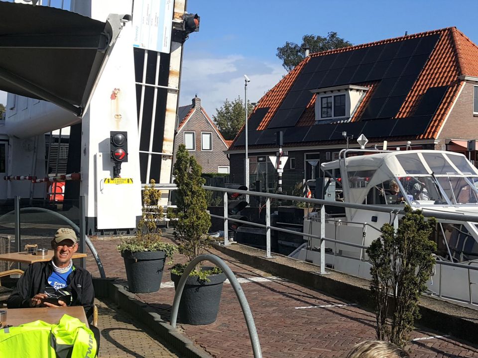 Vandaag rijden we veel op dijken. Regelmatig schijnt de zon. Elburg is een vestingstad net als Muiden. In Harderwijk moeten we afstappen daar waar veel terrassen zijn. Er staan speciale verkeersborden met de afbeelding van een serveerster erop. Ik meen tussen de wandelende mensen de vroegere eigenaar van de Radiobeurs Lisse te herkennen. Misschien heeft hij hier een boot liggen of deze man is heel iemand anders die toevallig op de Radiobeurs-meneer lijkt. Ik zal het niet weten, omdat ik hem niet heb aangesproken.