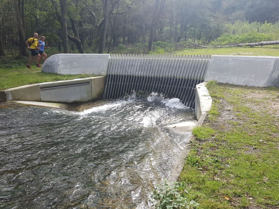Wandelen in de Amsterdamse Waterleidingduinen. Vandaag gaan we bij Oranjekom het duingebied in. Niet zoals meestal even een bakkie doen, maar direct aan de wandel. We volgen de oranje route. Al snel lopen we langs een smal kanaal met een betonnen bodem. Het water is erg helder. Vissen zien we vandaag echter niet. Het kanaaltje gaat over in een waterval daar waar het water door een duiker van anderhalve meter doorsnee gaat.