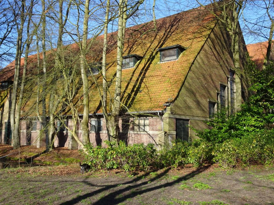 Reigersbergen, een mooi stukje bos/landgoed. We lopen op de rand van het bos en weilanden. Er loopt een Haagse ooievaar op het gras. Verderop ligt de stedelijke bebouwing van de hofstad.