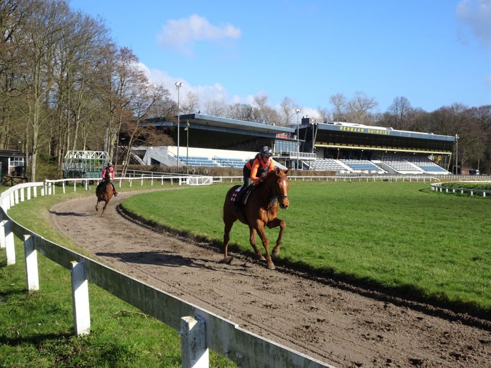 Duindigt heeft een renbaan van 1.600 meter. Twee paarden met berijders draven hier. Ik maak een foto met deze combinaties, de tribune op de achtergrond. Vijf minuten later. Voorbij de tribune zitten we op een bankje aan onze koffie. Twee dames komen langs op hun paarden. Zij waren het net, die ik op de foto had gezet. Ze vragen om de foto. Ik zal hem vanavond opsturen.