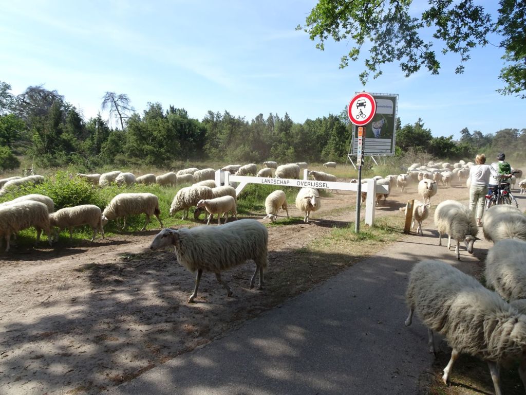 Een herder met zo’n 200 schapen en een hond komt ons tegemoet. We zetten de fietsen maar even op hun standaard. De herder vertelt dat de hond nog veel moet leren. Hij is nog jong.