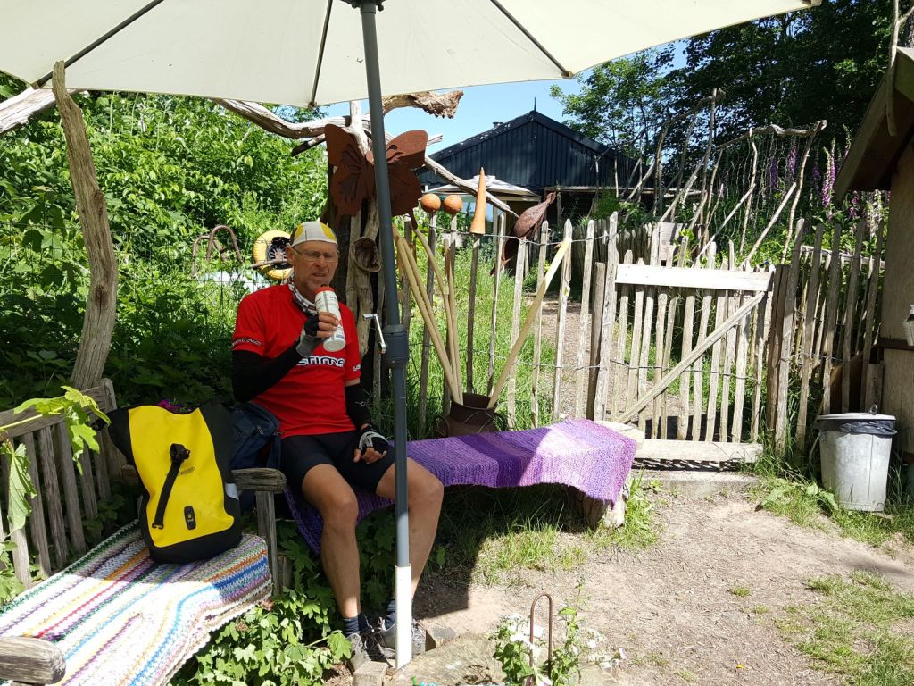 Bij een rustpunt worden we aangesproken door de eigenaar. Zijn vrouw en hij hebben hun baan in het bedrijfsleven opgegeven en runnen sinds kort een zorgboerderij. Hun deelnemers zijn vooral mensen die zijn vastgelopen in hun werkzame leven. Mensen met een burn-out bijvoorbeeld. De verwijzing en financiering vindt meestal plaats door de gemeente. De vrouw zet een karaf water met citroen op de tuintafel.