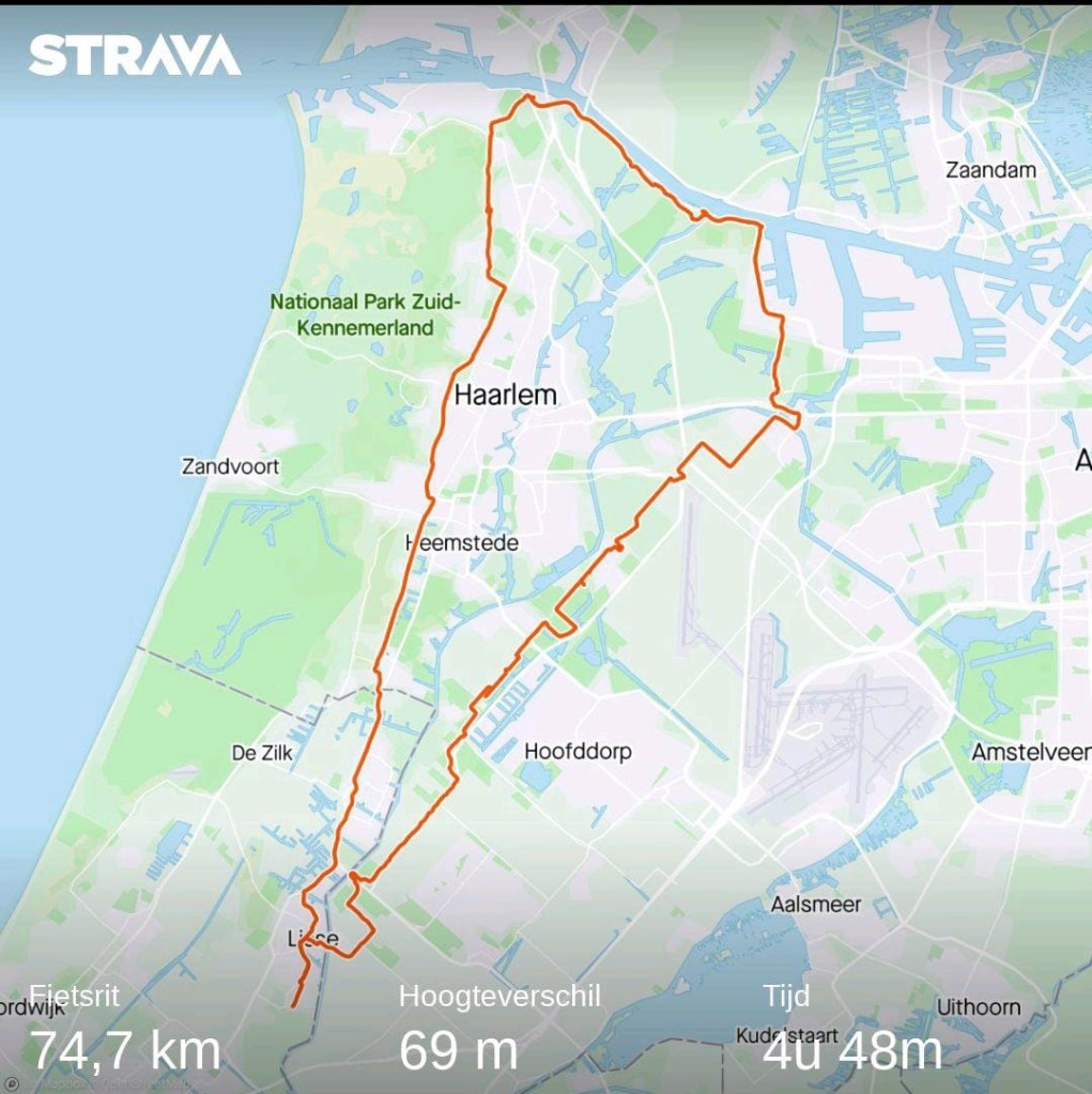 Fietsen met zus Margo: Hillegom, Heemstede, Haarlem, Velsen Zuid, Halfweg, Vijfhuizen, Cruquius, Lisserbroek, Lisse, 75 km.
