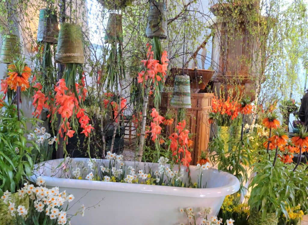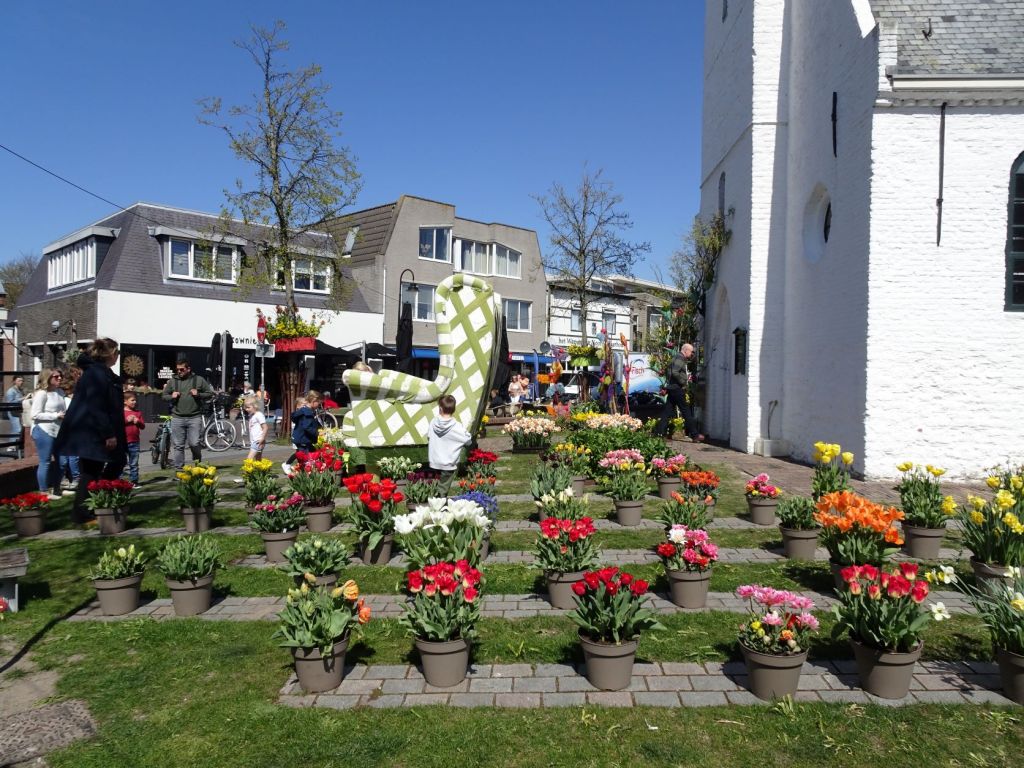 De Witte Kerk in Noordwijkerhout versierd met allerlei bloemstukken, vooral van bolbloemen. De toegang is gratis. Van 20 tot en met 23 april is een en ander te bekijken.