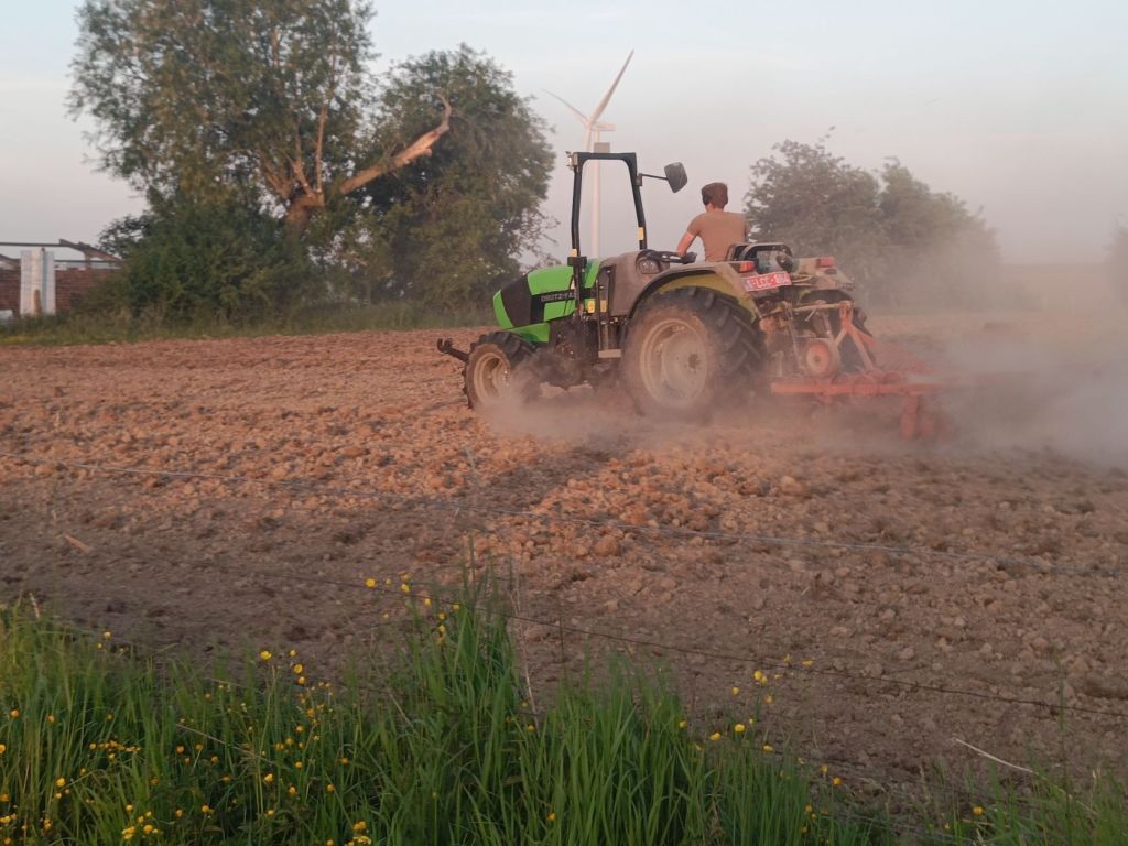 Ons avondeten nuttigen we in het hotel. Het wordt asperge op Vlaamse wijze. Deze wordt opgediend door een erg hard pratende ober. De man is waarschijnlijk doof en denkt dat wij dat ook zijn. Na het eten maken we een wandeling door het dorpscentrum wat er niet is. Er staan een paar huizen, verder is het alleen akkers aan beide zijden van de weg. We praten nog even met een jonge boer die zijn land had bewerkt met een eg. Door de droogte ging dat moeizaam. Op zijn land worden pompoenen ingezaaid.