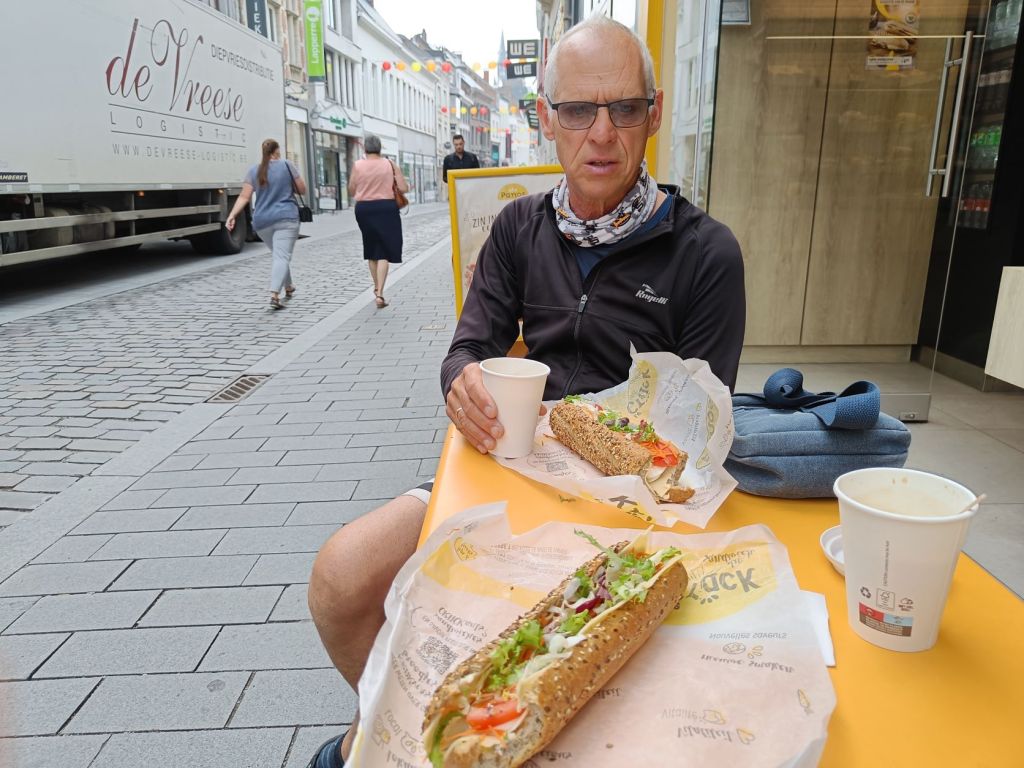 Vandaag hadden we een hotel zonder ontbijt. Daarom gaan we naar een PANOS, aan een zijstraat van de Grote Markt, voor koffie met een stokbrood gezond. Langs het riviertje de Kleine Nete gaan we de stad uit. We komen door dorpen met namen zoals Zandhoven en Pulderbos. Stel je er niet te veel van voor. Malle is een wat grotere plaats. Hier kunnen we terecht voor koffie bij een broodjeszaak net iets weg van het kruispunt. Een paar jaar geleden was deze broodjeszaak nog een stoofvleestentje. Meer is het laatste dorp voor ons in België.