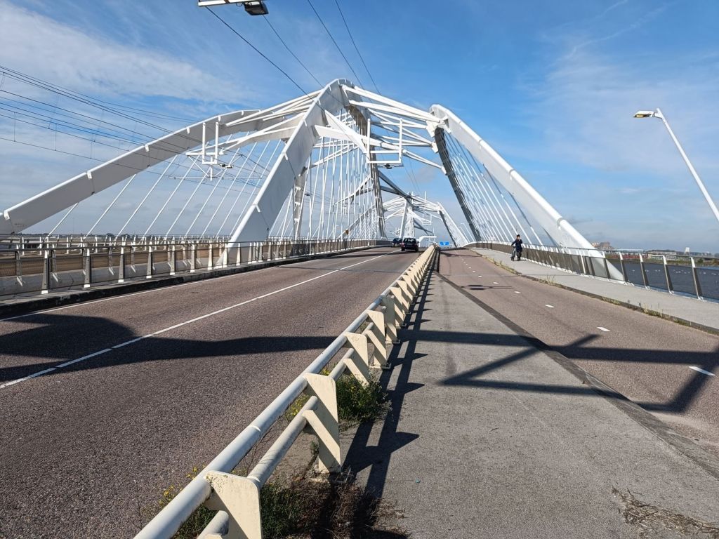 Aan het eindpunt van tram 26, halte IJburg, stappen we uit. In een koffiehuis, hier vlakbij aan de jachthaven, maken we een praatje met de eigenaar van het café-restaurant. Het is nu kwart voor twaalf en nog erg rustig in zijn bedrijf. Net als wij weet hij ook dat de Nesciobrug een paar weken is afgesloten voor voetgangers en fietsen in verband met onderhoud. In het Parool stond een artikel over klagende scholieren die ’s morgens en ’s middags tien minuten moeten omrijden. Wij hadden thuis al besloten de route uit het boekje Wandelen buiten de binnenstad van Amsterdam aan te passen. In plaats van over de Nesciobrug en door het Flevopark lopen we een stuk op het visueel minder aantrekkelijke Eiland Zeeburg. Overigens, de Piet Heintunnel is ook al een kleine anderhalf jaar afgesloten voor al het verkeer behalve tram 26.