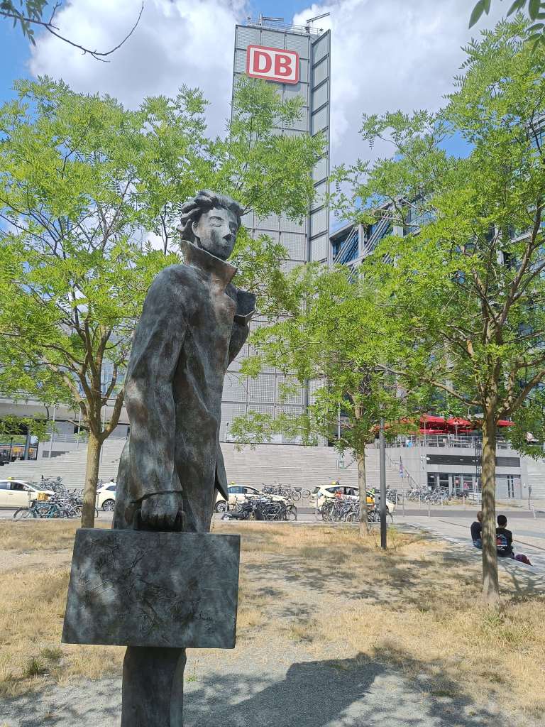 Het is druk bij het kaartjesbureau in het station, maar het lukt. We hebben tickets. We strijken neer op het terras bij de Food Factory Café Am Bahnhof, een immens groot eet- en drinkgebouw. We hebben een plek in de schaduw. Ze hebben geen alcoholvrij bier. In plaats daarvan gaan we aan de cassis bij een vegetarische maaltijd.