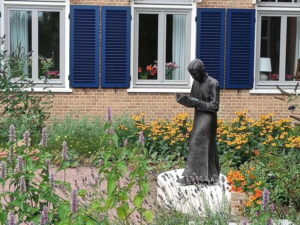 Overigens heeft de beroemde Franse schilder Monet een schilderij gemaakt van deze molen. De molen stond in die tijd nog in Rijnsburg. Voorbij Akzo Coatings komen we bij de Klinkenbergerplas. De plas mag vandaag niet van de noordkant worden benaderd omdat het muziekfestival PUUR wordt opgebouwd. Morgen barst het feest hier los. Via de andere kant kunnen we onze route naar Warmond wel vervolgen. We komen langs het vroegere grootseminarie. Hier staat een beeld van een katholieke geestelijke die aan het brevieren is. Brevieren.