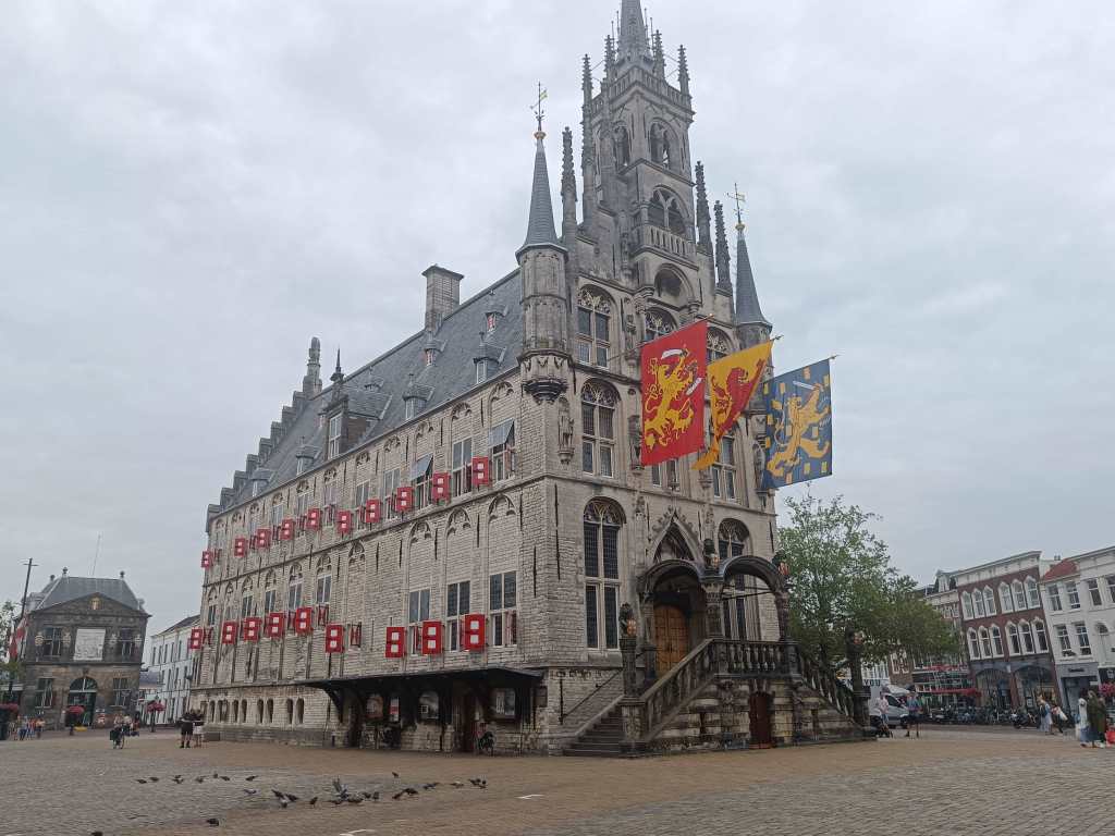 Er wordt regen voorspeld. Bij het Oude Raadhuis van Montfoort ziet de lucht er dreigend uit. Laten we hier maar opsteken voor een kop koffie. Het duurt niet lang voordat het gaat regenen. We pakken onze spullen op en gaan binnen zitten in het restaurant. Na ruim een uur stappen we weer op. Het regent niet meer. Later brengen we nog een bezoek aan Oudewater en Haastrecht.
