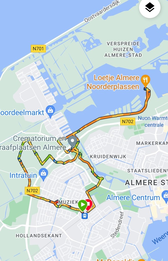 We volgen deels de route van Groene Wissels. Op ons keerpunt aan de Noorderplassen is een (biefstuk-)restaurant van het concern Loetje. Ook hier gaan we aan de koffie. Vandaag komen we ook langs het Zoneiland, een terrein in de vorm van een rond eiland met 520 zonnecollectoren van Vattenfall.