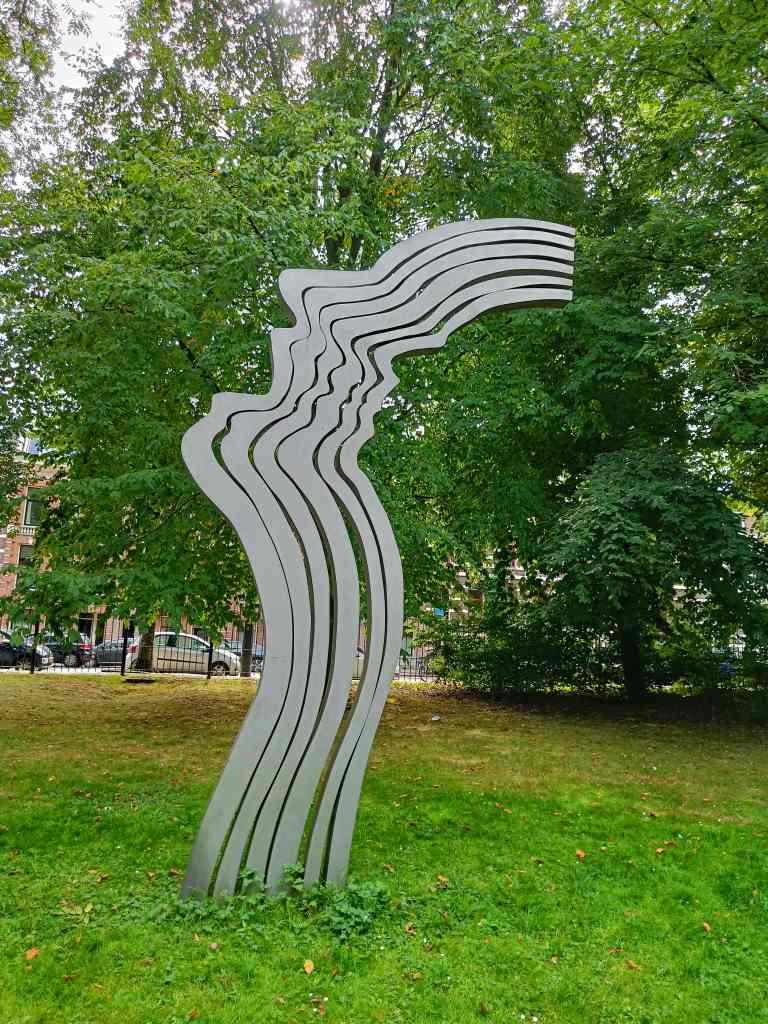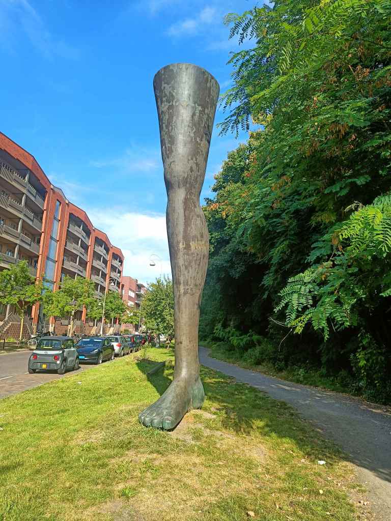 We komen langs het beeld van een bronzen been ‘Noch Einmal’ van de kunstenaar Henk Visch. Aan de andere kant van de ringvaart ligt het Oranje-Vrijstaatplein. Hier gaan we aan de koffie bij Coffee & Wine. Vlakbij staat de gevel van de vroegere Oostergasfabriek met een kunstgalerie hierachter gebouwd.