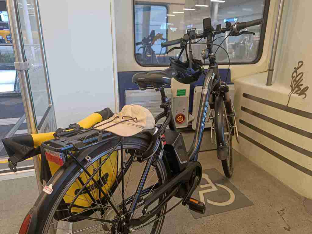 Bij station Sassenheim pak ik de trein richting Schiphol en verder. Het is knap druk in de trein. Gelukkig is er plaats voor mijn fiets en kan ik ook zitten. Mijn e-bike staat weliswaar op een invalideplek in plaats op een fietsplek. So what? NS ontmoedigt het meenemen van de fiets door de plekken in de nieuwe treinen kleiner te maken en de prijs van een fietskaartje jaarlijks meer dan evenredig te verhogen.