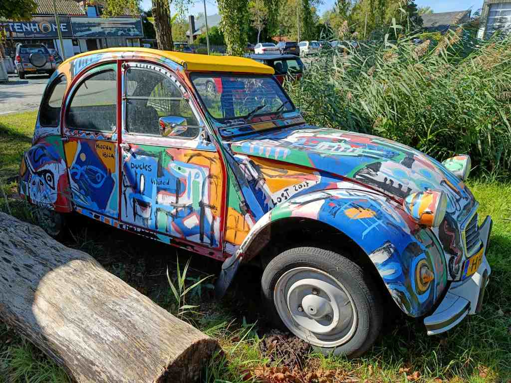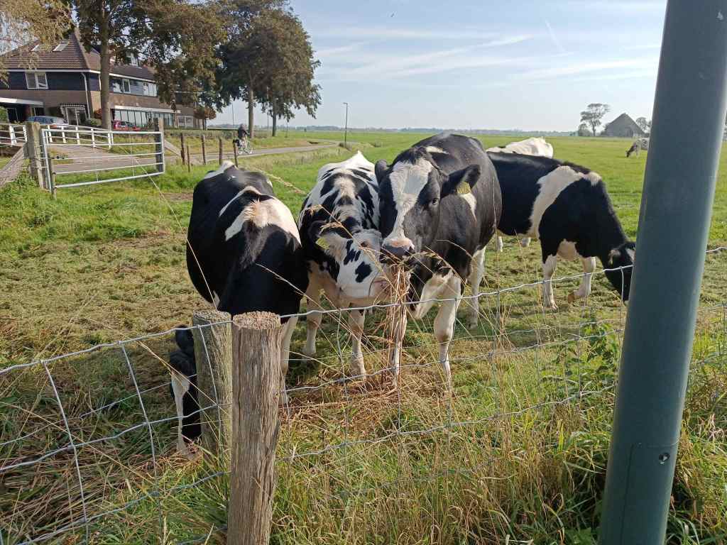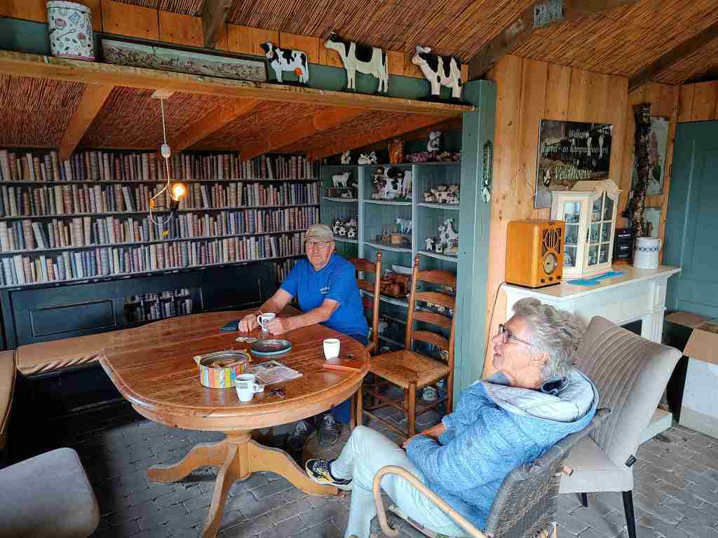 In het landelijk gebied van Hazerswoude-Dorp. Een klein bordje verwijst naar een boerderij met kleine camping. Hier kan je koffiedrinken met gratis uitzicht. Wij gaan kijken bij dit Rustpunt (*). De vader van de boer zit in rustruimte alleen aan de koffie met zijn 14-jarig doof hondje. Hij was net klaar met het voeren van de kippen. Voor ons schenkt hij koffie in vanuit een apparaat met keuzemogelijkheden. De achterwand van het optrekje staat stijf vol met boeken en in een kast staan porseleinen beeldjes. De een paar jaar geleden overleden vrouw van de 78-jarige gepensioneerde agrariër spaarde deze beeldjes. Ook staat er een vooroorlogse buizenradio die het nog prima doet. Onze gesprekspartner vertelt dat hij alles hier zelf heeft opgebouwd. Na de ruilverkaveling was er alleen een strook land. Inmiddels heeft zijn zoon de koeien weggedaan. Naast de camping zal hij ook wat gaan doen met paarden. De gepensioneerde boer vertelt zijn verhaal over hardlopen en wielrennen. Nu doen hij niet meer aan sport. Hij is lid geworden van een shantykoor. Nadat we de koffie hebben afgerekend groeten we de man en stappen weer op de fiets.