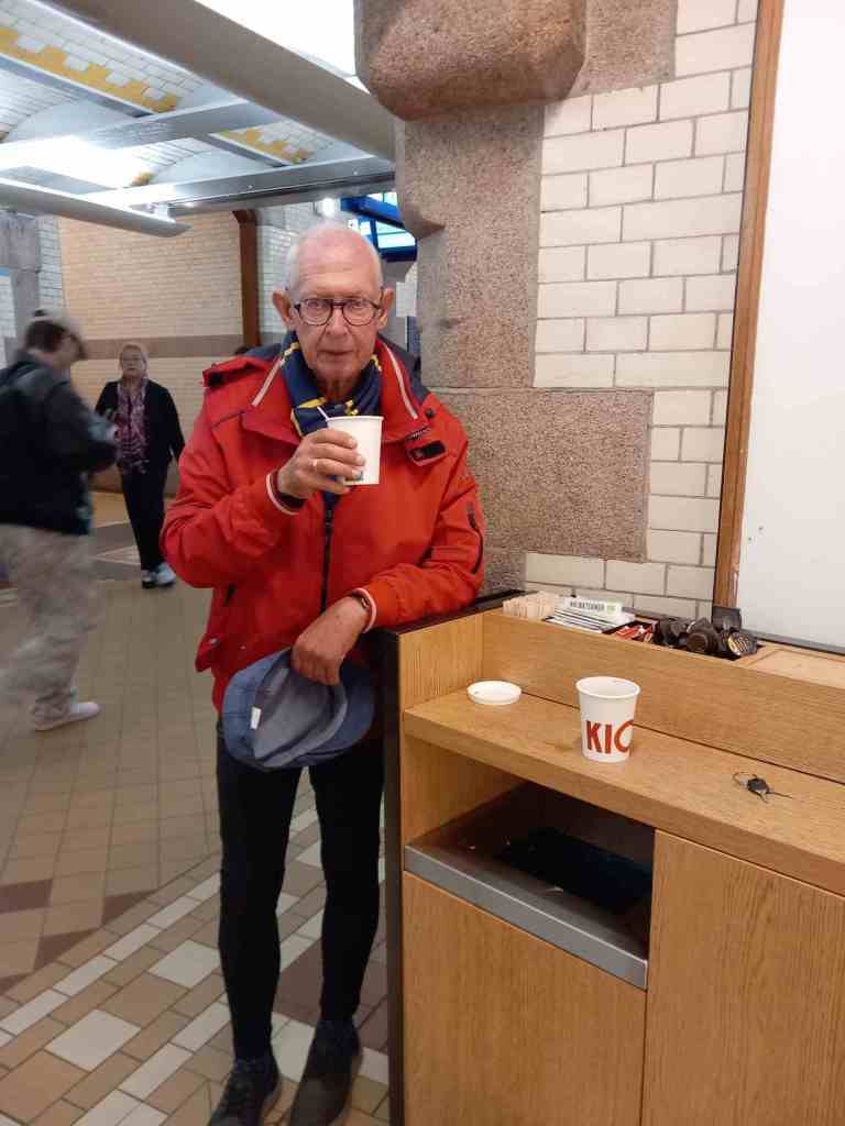 Omdat wij in Haarlem een ruime overstap hebben gaan we voor een koffie naar de Kiosk in het station. Wij staan bij een statafel als Frénk van der Linden binnen komt om een krant te kopen. Deze journalist is snel weg en daarna weer snel terug. Hij had de krant van gisteren gekregen in plaats van een exemplaar van vandaag. Een paar weken geleden stond in de krant een paginagroot artikel naar aanleiding van het uitkomen van een nieuw boek van Frénk. De foto bij dat artikel toonde een kale BN-er. Zijn haar begint nu weer goed te groeien.