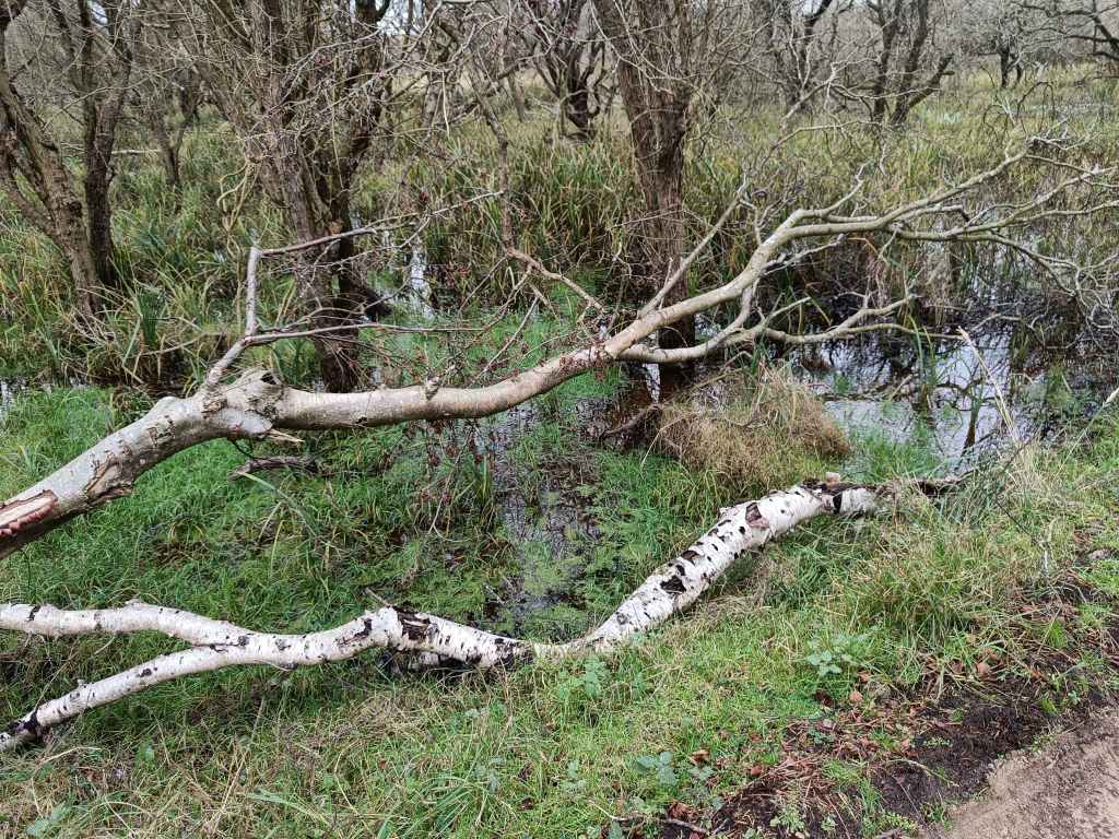Het is mij bekend dat het zaak is om waterdichte schoenen of laarzen aan te hebben. Er zijn hier en daar vlonderpaden gemaakt van planken met gaas daarop vastgeniet. Eén stuk van ongeveer 100 meter is erg drassig. Zoveel mogelijk lopen we hier langs de kanten. Het is te doen. Verder hebben we vandaag niet te klagen qua natte ondergronden. En: We hebben geen regen.