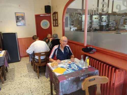 Het gaat weer regenen. Als ik het dorpje Saint-Gilles passeer is het 12.00 uur. Er hangt een bord aan de brug met een tekst die aangeeft dat het plaatselijk restaurant een dagmenu serveert. Ik geef aan dat ik geen wijn wil bij het eten; er moet immers nog gefietst worden. Toch wordt er een karafje met dat rode spul neergezet. Als de kok langs kom zeg ik nogmaals dat ik geen wijn wil. Hij maakt een nonchalant gebaar maar laat de wijn staan. Waarschijnlijk bedoelt hij dat het gratis is. Even daarna neemt de serveerster het op mijn verzoek wel mee terug naar de keuken.