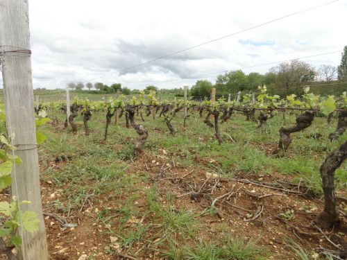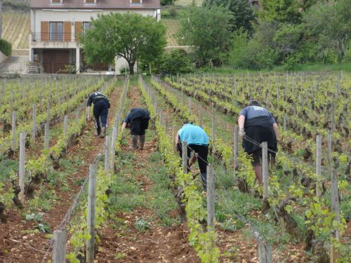 Ook de dorpen voorbij deze plaats staan in het teken van de druiventeelt. Op het land zijn veel werkers bezig met de nog zielige druivenplantjes. In Paligny-Monttrachet zie ik een beeld van druivenwerkers dat ik eerder in 2010 zag tijdens mijn fietstocht naar Mâcon.