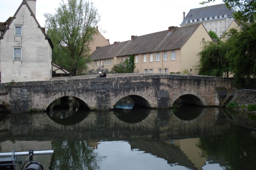 In Bonneval is de straat geblokkeerd omdat er markt is. Ik koop er gelijk wat tomaten voor op het brood. Dan zie ik dat de marktkoopman pal voor het gemeentehuis staat. Daar staat een bord richting de VVV. De VVV blijkt echter gesloten, daarom maar het gemeentehuis in voor een stempel. De mevrouw aan de balie snapt zonder dat ik al iets gezegd heb, dat ik voor een stempel kom. Daarna nog even een stokbrood gekocht. De bakkersvrouw vraagt of ze het brood moet (door)snijden. Ik zeg: “nee”. Per slot van rekening heb ik een mes bij me en een stokbrood kan je ook breken. Bij fietstochten in latere jaren liet ik het stokbrood wel regelmatig doorsnijden. Dat is makkelijker op te bergen in de fietstassen.