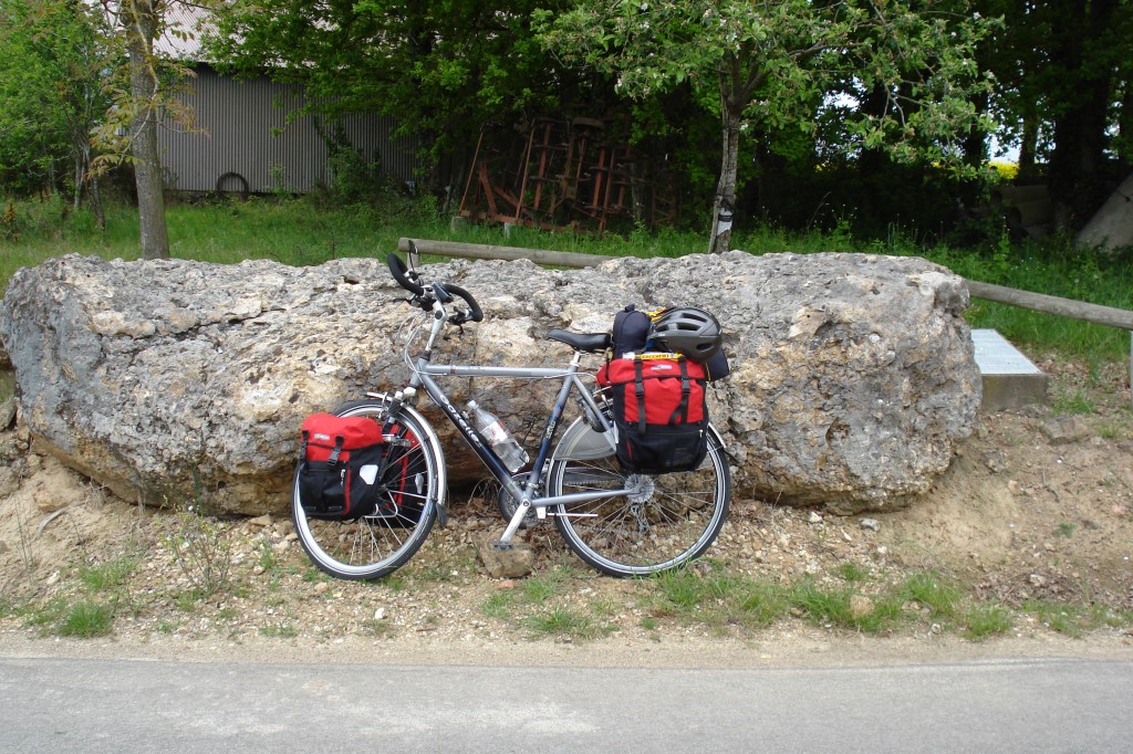 Om 11.45 neem ik mijn lunch, gezeten op de voet van een kruisbeeld op een kruispunt van boerenwegen. Ik voel me als God in Frankrijk. Met mijn, een uur geleden bij een bakker gekocht, stokbrood tezamen met tomaat van gisteren van de Lidl, heb ik een geweldige lunch. Het is een erg rustige Franse omgeving hier. Mijn water is op. Ik zie een mevrouw in de tuin van het boerderijtje achter het kruisbeeld. Ik vraag om wat water. Ze zegt Oké en komt met anderhalve liter bronwater aanzetten. Gratis. Om 12.00 uur hoor ik het alarm van de BB. Het is de eerste woensdag van de maand. Bij ons in Nederland is dat de eerste maandag van de maand.