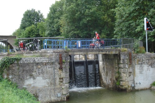 Nadat ik terug ben gefietst naar het dorp zonder hotel volg ik een heel stuk een kanaal. Er bloeien veel bloemen in de kanten langs het jaagpad. Omdat er een paar sluizen worden gereviseerd staan stukken van het kanaal bijna droog. VNF, de beheerder van het kanaal, heeft de scheepvaart stilgelegd. Twee dames, één uit Nederland en de andere uit Australië zijn een stukje fietsen, omdat hun boot stil ligt en ze een aantal dagen dus niet kunnen varen.