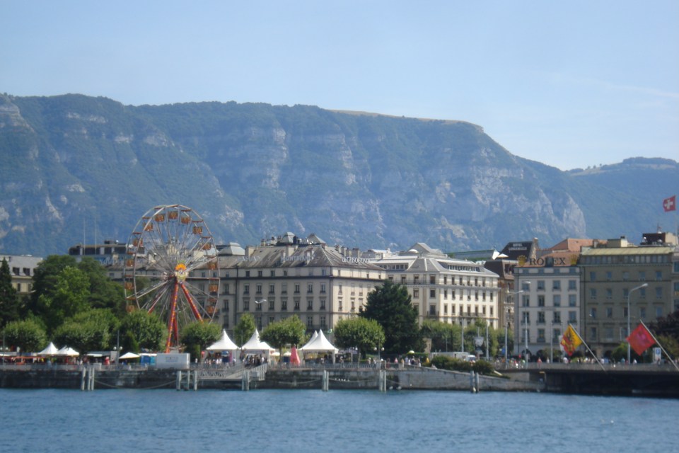 In Genève heb ik nu ruim twee uur overstaptijd. Daarom even naar het Meer van Genève. Als ik de fontein zie spuiten, herinner ik me een eerdere keer dat ik hier was samen met Joke. Dan het lastige van de Zwitserse frank. Je kunt hier wel met euro′s betalen, maar dan krijg je van die stomme franken terug. Toch maar wat eten, wat drinken en drinken mee voor in de trein. Op een groot scherm staat dat het hier 28 graden is en in Basel zelfs 30 graden.