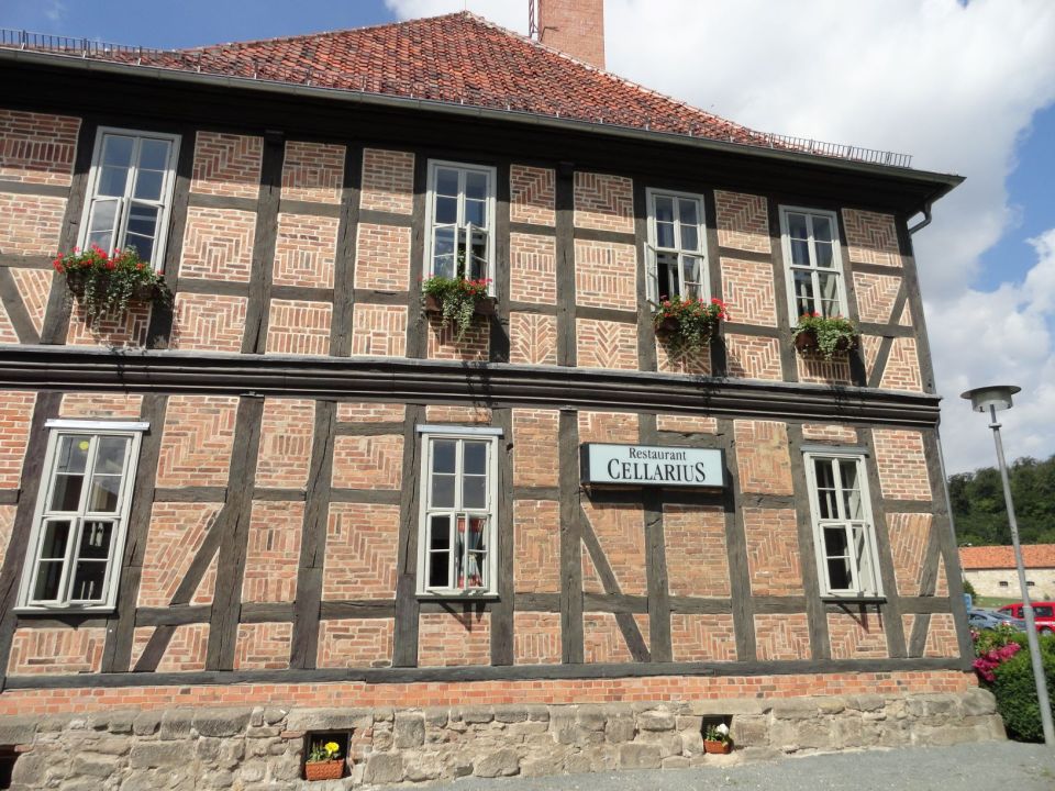 Om 10:50 uur zijn we bij het gerenoveerde klooster Michaelstein. Het café-restaurant gaat om 11:00 open, staat op het bord. We gaan alvast naar binnen en vragen of we hier koffie kunnen drinken. We kunnen op het terras achter de zaak zitten. Hoewel het wat winderig is is het ook zonnig.