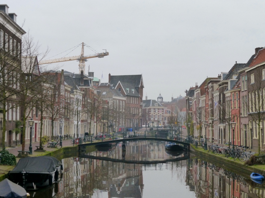 Oude Rijn met op de achtergrond de kraan bij V&D en de Waag