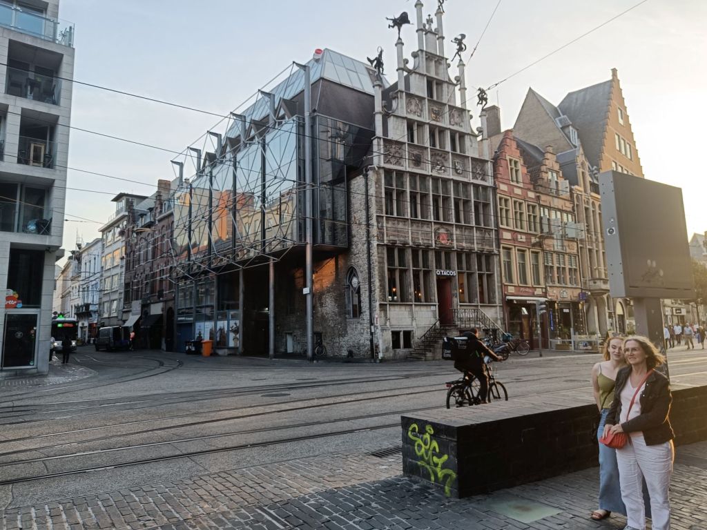 Ons VodF-adres staat in Gentbrugge, een stadswijk van Gent. We laten de fiets op ons overnachtingsadres staan en gaan met de tram naar het centrum van Gent voor eten en een rondwandeling. Betalen in de tram gaat anders dan in Nederland. Je houdt je bankpas tegen een speciaal apparaat. Dan verschijnt er een groene vink op het scherm. Een standaardbedrag wordt van je bankrekening afgeschreven. Bij eventuele controle kan de controleur van je bankpas aflezen dat je hebt betaald.
