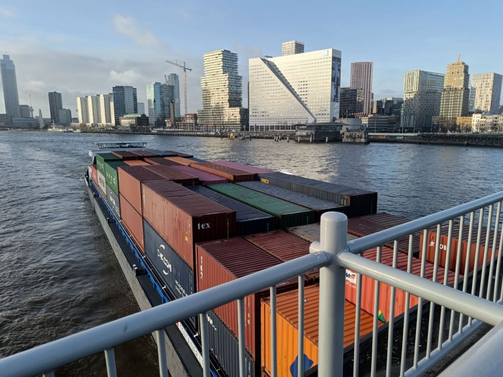 We wandelen over het buitenterrein van het Havenmuseum. We passeren de Glashaven en lopen een stukje over de Boompjes aan de kant van het water. Ja ook vandaag gaan we over de Erasmusbrug. Aan de overkant heet het de Kop van Zuid met de hoge kantoortoren van Deloitte. Later steken we de rode Willemsbrug over.
