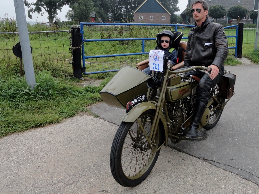 Omdat we in juni tijdens onze fietstocht langs de IJssel het pont bij Bronckhorst niet over konden, passen we de fietsroute nu aan. Ten zuiden van Zutphen steken we de rivier per brug over. Op de Markt van Brummen staan kermisattracties maar het dorp is vanmorgen rond 10 uur uitgestorven. Geen kip te zien en alles nog dicht. Bij het pont naar Bronckhorst echter komt een sliert antieke motoren ons tegemoet. Ze houden een rally of iets dergelijks.