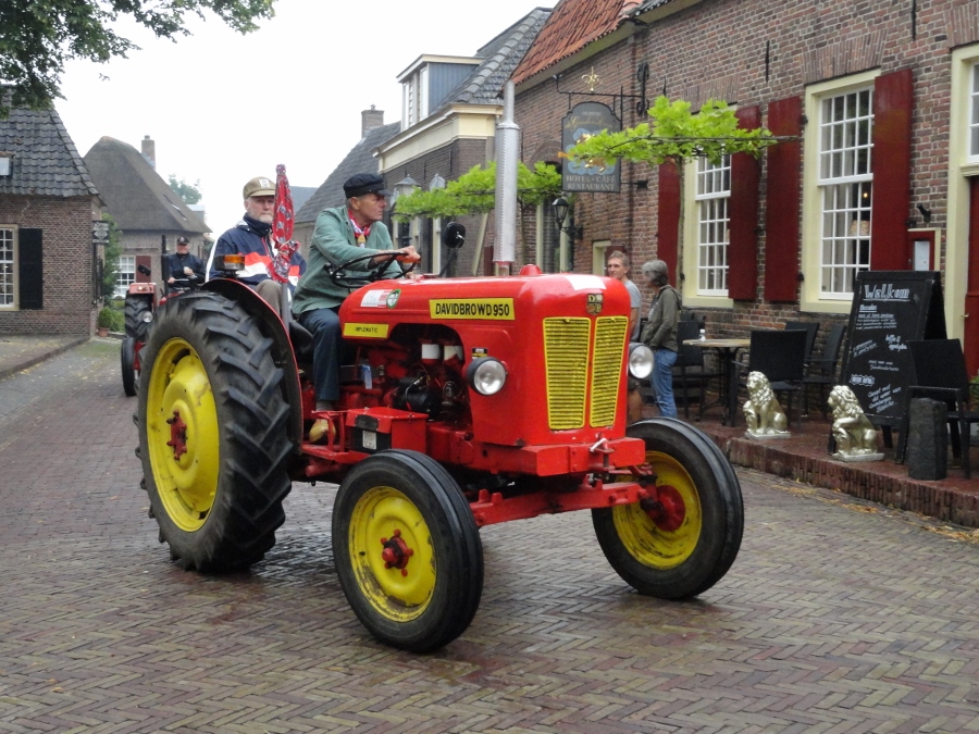 In Bronckhorst is een restaurantje open. Dat komt goed uit want het begint te regenen. Hier op de hoek komt nog een optocht langs en wel van oude tractoren. Het zijn er meer dan honderd. Als de regen over is halen Joke en ik de fiets weer van het slot en vervolgen onze weg. Voordat we bij Doesburg de IJssel gaan verlaten pikken we daar ook nog even een terrasje. Ook bezoeken we Doetinchem, de grootste plaats van de Achterhoek.
