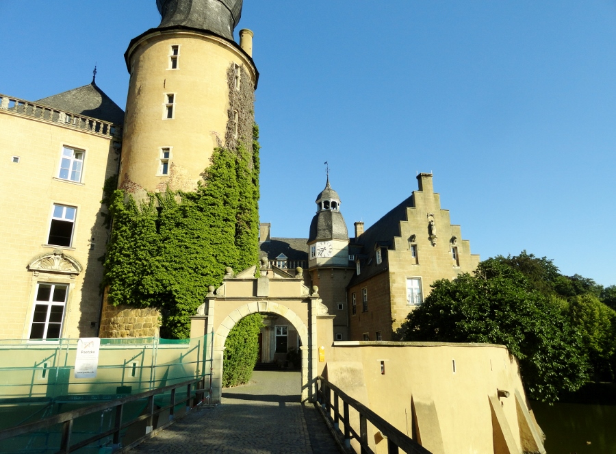 In Velen nemen we uitgebreid plaats bij Sportkasteel Velen. Er is geen stukje papier of peukje te zien op het plein voor de trappen naar de ingang. Toch wordt het stukje plein minutieus aangeveegd met een elektrisch straatveegapparaat.