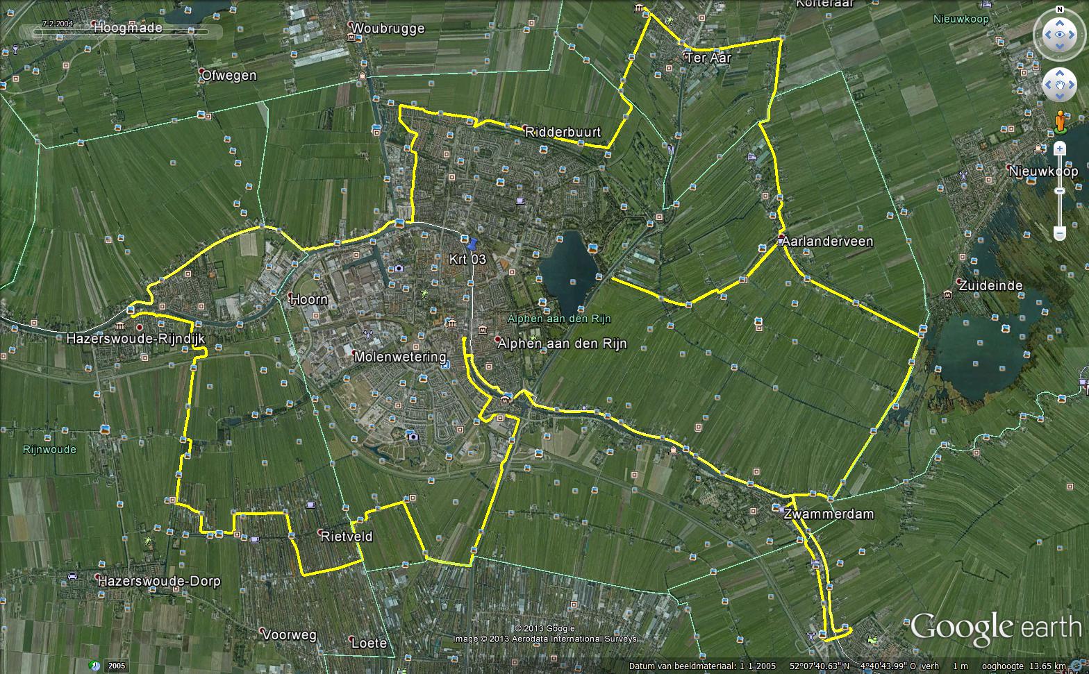 In dit dorp wordt de versiering boven de doorgaande straat opgeruimd. Het jaarlijks zomerdorpsfeest is afgelopen. Het volgende dorp is Ter Aar. Ik fiets tegen de klok in een rondje om Alphen aan den Rijn. Menig fietser kom ik vandaag tegen. Het zijn vooral senioren die de fiets genomen hebben.