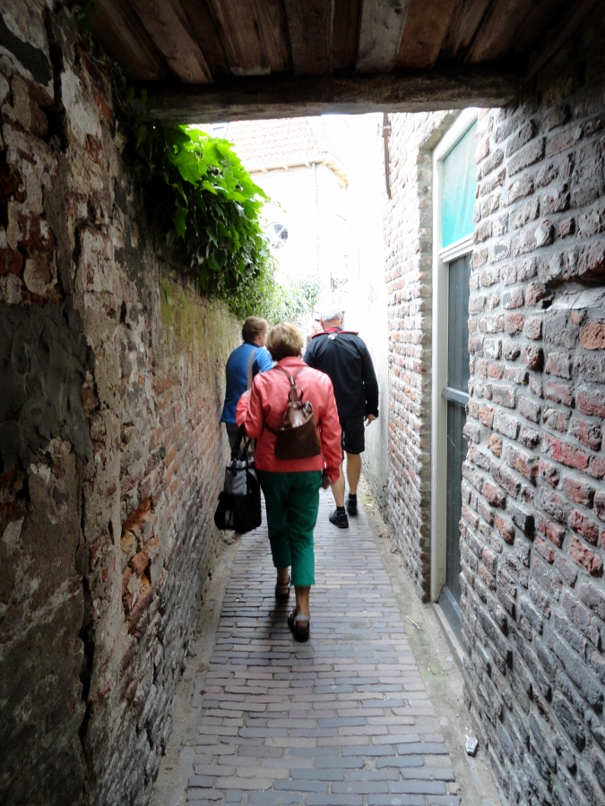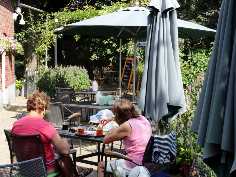 Onze eerste stop is in het boekenstadje Bredevoort. Ze hebben hier een Middeleeuws café-restaurant. Een paar jaar geleden is een deel van de houten banken in het restaurant vervangen door gewone stoelen. Het oogt niet zo Middeleeuws meer als toen ik hier vroeger met Bert een keer was, maar het zit natuurlijk een stuk lekkerder. Wij zitten vandaag op het terras, het is immers zomers weer.