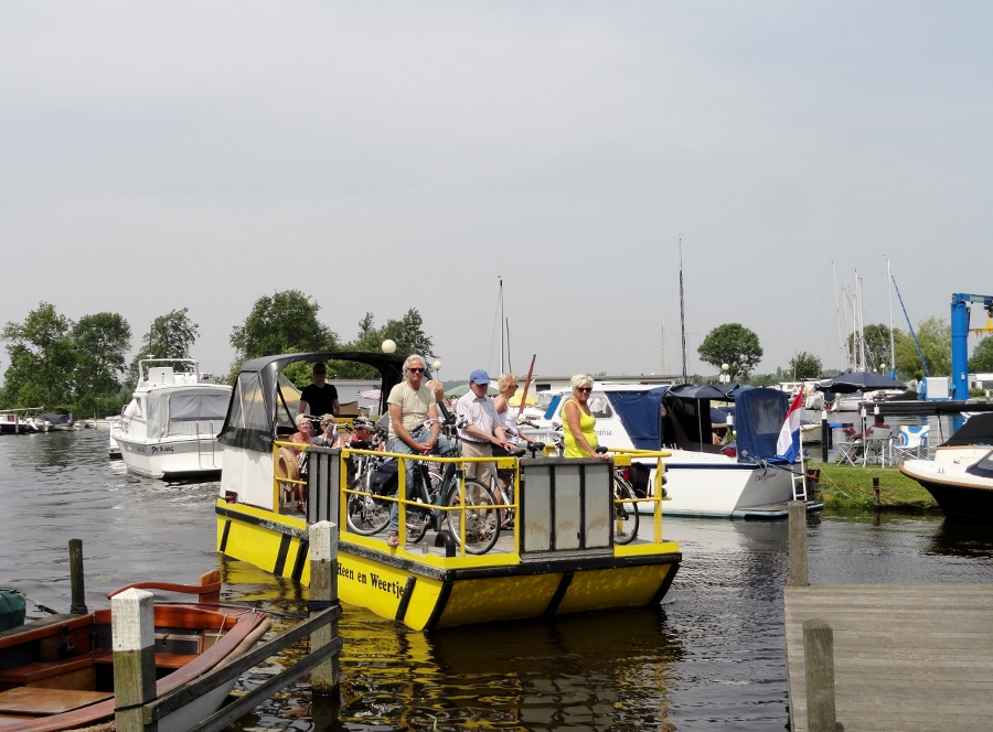 Later gaan we ook nog even naar de Boekhorsterweg bij Oud Ade, een doodlopende weg die voert naar camping ’t Haasje in Warmond. Hier kan je ’s zomers met het Heen-en-Weertje, een pont waar maar 12 personen tegelijk mee mogen, naar het Kaageiland. Piet en ik kunnen niet meer op het pontje als er al 16 personen plus fietsen opstaan. Wij zijn genoodzaakt om even op het terras van de camping plaats te nemen en een ijskoud witbiertje naar binnen te werken. Dat is pech.
