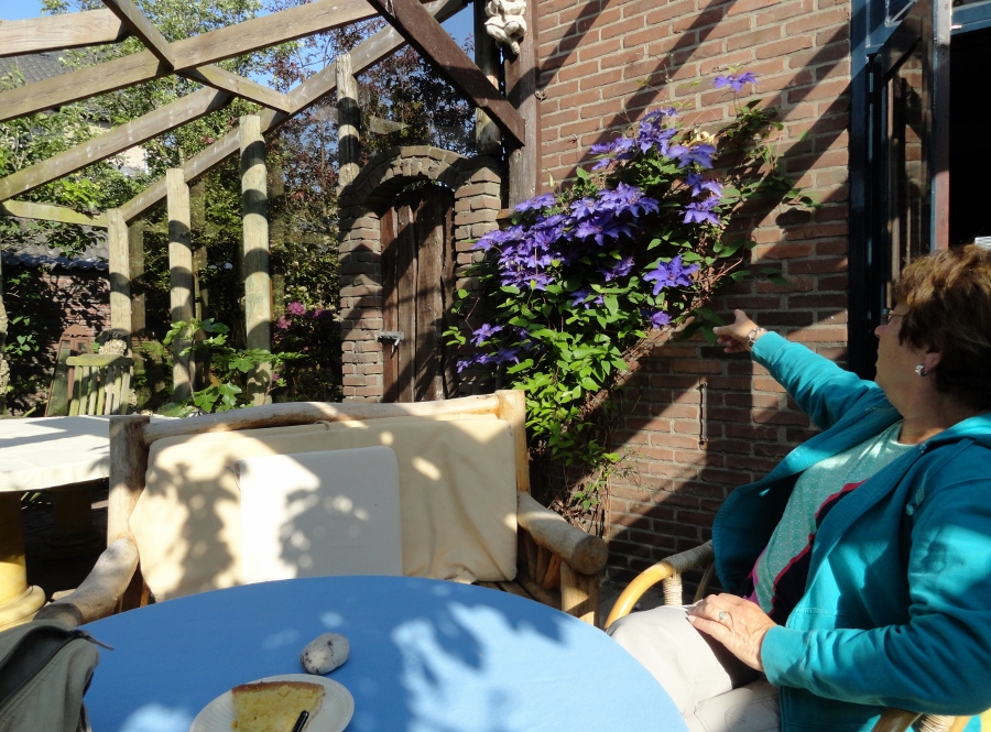 Na ons prima ontbijt zet de mevrouw van ons Vrienden-op-de-Fiets-adres nog snel twee koppen koffie omdat ze straks met vriendinnen een dagje Amsterdam gaat doen. Wij kunnen kalm aan doen op het terras van haar mooie achtertuin en krijgen de sleutel om straks zelf de boel af te sluiten.