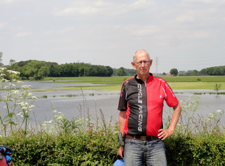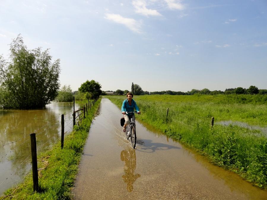 Na een paar honderd meter over het toch wel behoorlijk smalle bospad te hebben gereden komen bij een fietssluis. We fietsen weer terug naar de harde weg. Het fietspad langs de IJssel staat ergens blank als gevolg van het hoge water van de IJssel. Er staat ook een bord met de tekst “Verboden Toegang”. Heel langzaam fietsen we verder; op het diepste punt staat het water 10 cm hoog.