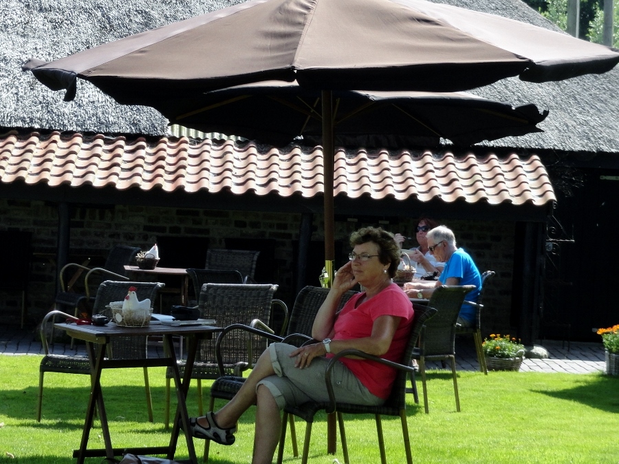 Bij Een-West zijn we ongeveer op het drielandenpunt van Friesland, Drenthe en Groningen. Omdat het vandaag een erg warme dag is pikken we bij Roderesch al weer ons derde terras van vandaag. Er is hier nog plek in de schaduw.