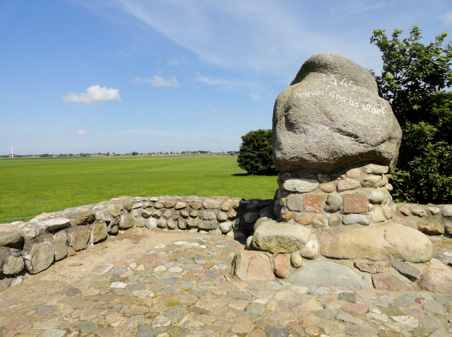 In Ossenzijl gaan we aan de koffie bij het café met uitzicht op de brug en de sluis. In Lemmer is het inmiddels 12 uur. Ook aan dit stadje hebben we herinneringen. We nemen hier onze middagpauze. We fietsen nu door het zuiden van de provincie Friesland, de wind regelmatig vol op de kop. Bij Rode Klif staat een monument ter herinnering aan een zeeslag in 1345. Op het monument staat in het Fries ‘Liever dood dan slaaf’.