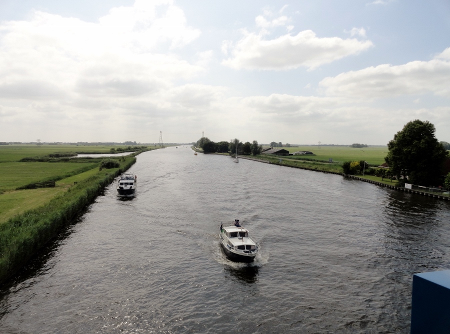 Meer dan tien jaar geleden deden Joke en ik een paar keer een dagje Weerribben. We gingen dan vroeg van huis met de fietsen op de drager achter de auto. Vandaag fietsen weer langs de doorgaande waterweg, waarop veel plezierbootjes te zien zijn. Steeds rijden we weer over de witte bruggetjes van de talloze zijsloten.