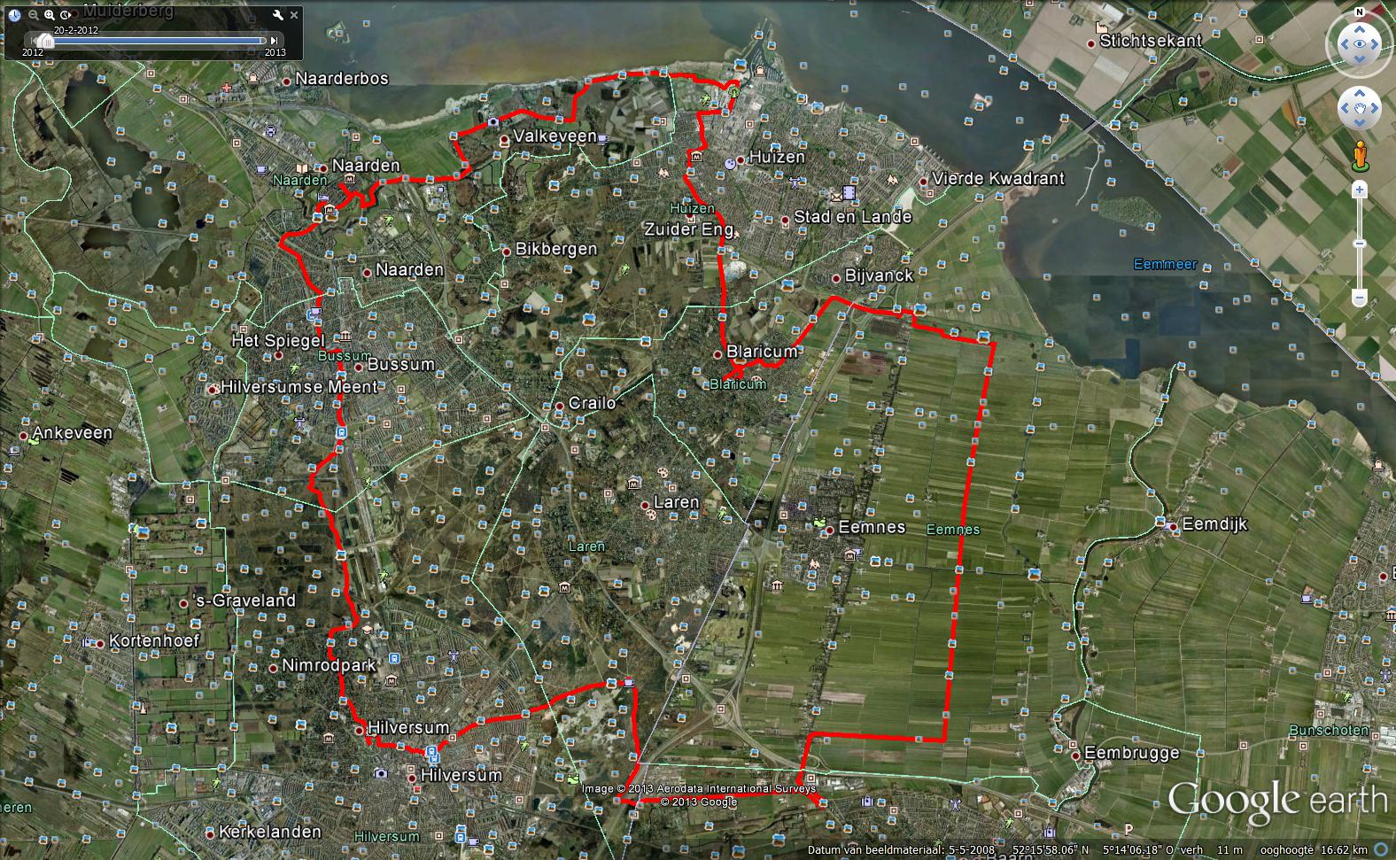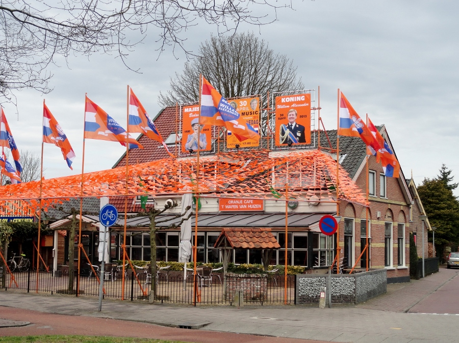 In Huizen is een café al helemaal in de ban van de kroning. Het gebouw is versierd met oranje linten. We komen langs de Kalkovens van Muiden. Dan rijden we een stuk met het Gooimeer aan onze rechterhand. In Naarden Vesting vinden we een plekje in de zon op het terras bij een koffiezaak aan de dorpsstraat.