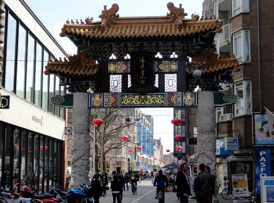 Mijn jongste broer was vorige week in China. Wij fietsen door China Town Den Haag. Zowel aan het begin als het eind van deze Chinese buurt zijn bogen geplaatst, de winkelstraat is versierd met rode lampionnen.